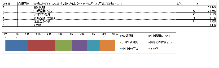 全世代の夫婦の不満を調査した結果、原因の主な理由は生活習慣の違い24.24%、金銭問題20.89%となりました。